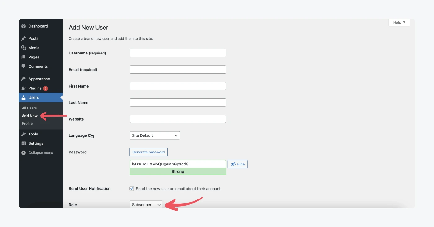Secara default, situs Anda hanya akan memiliki nama Anda di dalamnya. Untuk menambahkan user baru, klik Add New . Anda akan dialihkan ke page add user untuk menambahkan detailnya. Anda diminta untuk memberikan nama pengguna dan email mereka. Form lainnya adalah opsional.