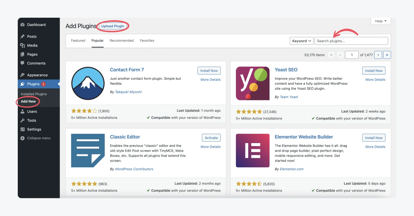 Plugin adalah perangkat lunak tambahan untuk menyesuaikan situs web Anda. Mereka dapat membantu Anda meningkatkan keamanan, mengoptimalkan SEO, mengintegrasikan obrolan langsung, dan masih banyak lagi.