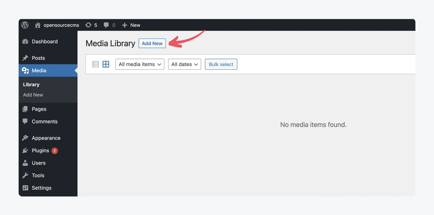 Buka tab Media . Tab ini akan kosong untuk saat ini. Setelah Anda mulai membuat situs web WordPress dan mengunggah gambar dan video, Anda dapat melihat semuanya di sini.