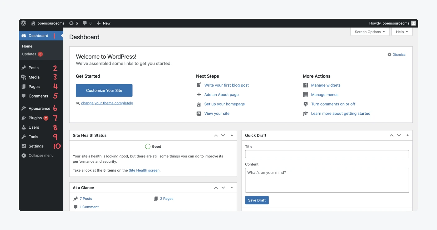 - Dasbor : Status situs web Anda saat ini (Kesehatan, Komentar, Posting, Aktivitas). Anda juga dapat melihat tindakan apa yang direkomendasikan WordPress untuk membantu Anda memulai di situs web Anda.